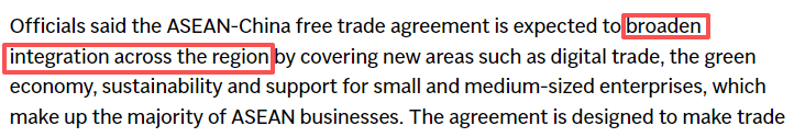 10月28日,中国-东盟自贸区3.0版本升级协议在马来西亚吉隆坡签署。 3.0版本升级协议共涵盖数字经济、绿色经济、供应链互联等9个领域。议定书的签署引起了国际舆论的广泛关注。不少媒体认为,中国-东盟自贸区3.0升级协议对于帮助实现经济经济一体化、增强产业链供应链稳定性具有重要作用。 “锦上添花” 美联社报道认为,中国-东盟自贸区升级协议3.0的签署,是区域贸易蓬勃发展的“锦上添花”。美联社网站报道截图援引东盟官员的话称,东盟-中国自由贸易区3.0版预计将通过数字贸易、绿色经济以及持续支持小规模企业扩大区域一体化。和中型企业(占东盟企业的大部分)。该协议旨在扩大贸易优惠制度,改善小企业的市场准入,简化非关税程序并减少监管壁垒。美联社(AP)网站报道还援引分析师的话说,中国和东盟都可以从升级后的自由贸易协定中受益,特别是在供应链和可持续发展领域。 “为各方带来长期利益” 亚洲新闻频道报道称,中国与东盟签署的自贸区3.0升级协议旨在发展长期经济韧性,加强经济一体化。亚洲新闻频道(CNA)网站报道截图援引新加坡总理黄循财的话称,该协议的有效实施将为整个地区带来新的经济机遇。他强调:“只要东盟和中国继续努力,新加坡贸工部发表声明称,中国-东盟自贸区3.0版为数字经济、绿色经济、供应链互联互通等关键新兴领域的企业提供了新的机遇。半岛电视台的“双赢结果”报告认为,在中国与东盟贸易持续增长的同时,中国-东盟自贸区升级已经到来半岛电视台网站报道截图称,中国与东盟虽然互为最大贸易伙伴,但贸易规模的不断增长很大程度上反映出该地区生产和供应链一体化的趋势日益增强,报道认为,中国-东盟自贸区3.0升级协议的签署正值双方都希望进一步加强双边关系之际。兴高采烈,实现“双赢”。编译、图文:杉杉