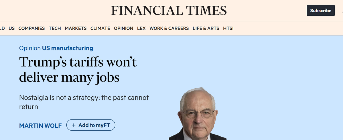 中国日报10月10日电 英国《金融时报》副主编兼首席经济评论员马丁·沃尔夫8日发表评论称,事实表明,特朗普管理层奉行的贸易保护政策并没有兑现其对选民的基本承诺——对于有时依赖传统产业但现在面临区域经济崩溃状态的工人来说。他进一步表示,这种承诺本质上是空洞的,其政策的本质是为政府本身及其背后的富裕阶层寻找利益。报道截图 沃尔夫援引哈佛大学肯尼迪政府学院和彼得森国际经济研究所资深教授罗伯特·劳伦斯今年6月的一项研究称,尽管特朗普政府的贸易政策成功消除了贸易贸易缺失,但其对加强工作的影响将极其有限。高关税政策似乎有重大影响吃气势,但其实效果不大。此外,研究结论仍然乐观。沃尔夫认为,现实中,美国的贸易逆差能否缩小,取决于美国国内产出与支出之间的平衡。财政不足是支撑外部不足的主要内部因素。在工作紧密贯穿、移民政策日益严格的背景下,如果想减少外部赤字,就需要收紧联邦预算。然而,从今天的情况来看,关税政策对财政赤字的净影响几乎是不可逆转的。当外亏没有了,美国的国家支出就会减少,人的实际感受可能不是增加而是减少。此外,关税本质上是一种税收调节(有效税率随着纳税人收入和财富的增加而逐渐降低的税收制度),从而增加了低收入群体的负担。关税和“又大又美”的法案的叠加,正在进一步加剧社会分配的不公平。正如美国经济学家保罗·克鲁格曼(Paul Krugman)所强调的那样,医疗保险补贴的扣除导致政府做空,这将给那些应该得到特朗普政府关税政策援助的群体带来沉重打击。洛桑国际管理发展研究所的理查德·鲍德温表示,从历史经验判断,特朗普政府推行的全面改变进口的做法,受保护产业很难提高竞争力,反而进一步陷入与全球市场脱钩的过程。如果美国执意重蹈覆辙,结果也不难预料——尤其是在拒绝科学、已经放弃清洁能源举措的环境下。所谓的“保护主义”政策无非是短视、不间断之举。现实生活中的数据也为这一观点提供了有力的支持。哥伦比亚广播公司新闻报道称,8月份美国制造业就业岗位减少12,000个,自4月份以来总共损失了42,000个就业岗位。美国进步中心(CAP)指出,原因在于特朗普政府的大额新关税、强硬的移民政策以及“又大又美”的法案。哥伦比亚广播公司新闻报道截图 此外,美国劳工部的数据至今也显示这一点。文章指出,政策的不确定性正在给企业带来压力。特朗普政府4月份宣布所谓“奖励关税”时,声称此举将减少美国与经济伙伴之间的贸易短缺,促进劳动力就业岗位回流,以保护工人;然而,当前关税政策的规模和规模的不确定性导致增加了制造商的成本并抑制了租金的愿望。据美国就业机构Challenger Grey Christmas报道,该汽车制造商在7月份宣布将取消近5,000名员工时,略微将关税归咎于关税。该公司还指出,零售业也因经济不确定性而推动消失和商店关闭。